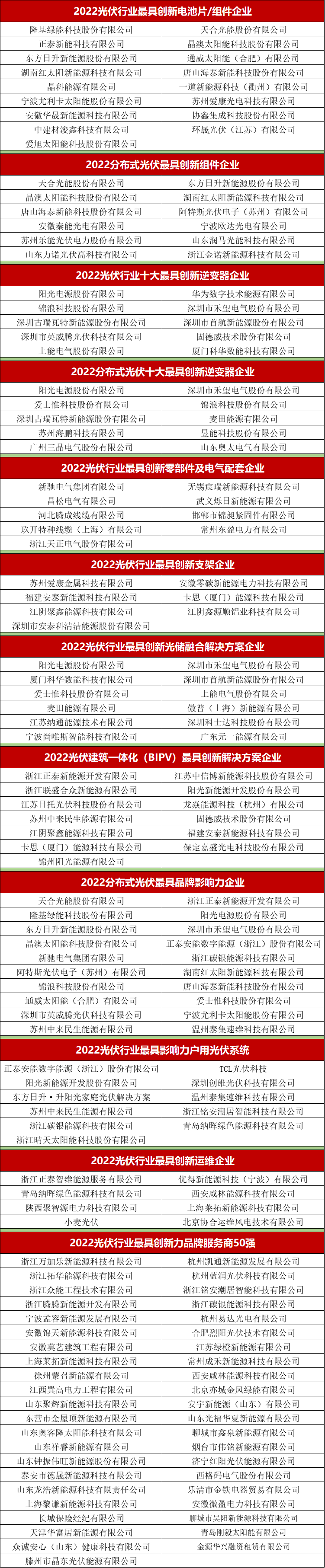 「PV TOP 50」2022光伏創(chuàng)新榜除了發(fā)布“2022光伏行業(yè)最具創(chuàng)新力品牌服務商50強”榜單,同時也評選出了“2022光伏行業(yè)最具創(chuàng)新電池片/組件企業(yè)”、“2022分布式光伏最具創(chuàng)新組件企業(yè)”、“2022光伏行業(yè)十大最具創(chuàng)新逆變器企業(yè)”、“2022分布式光伏十大最具創(chuàng)新逆變器企業(yè)”、“2022光伏行業(yè)最具創(chuàng)新零部件及電氣配套企業(yè)”、“2022光伏行業(yè)最具創(chuàng)新支架企業(yè)”、“2022光伏行業(yè)最具創(chuàng)新光儲融合解決方案企業(yè)”、“2022光伏建筑一體化(BIPV)最具創(chuàng)新解決方案企業(yè)”、“2022分布式光伏最具品牌影響力企業(yè)”、“2022光伏行業(yè)最具影響力戶用光伏系統(tǒng)”、“2022光伏行業(yè)最具創(chuàng)新運維企業(yè)”等十一大創(chuàng)新獎項。