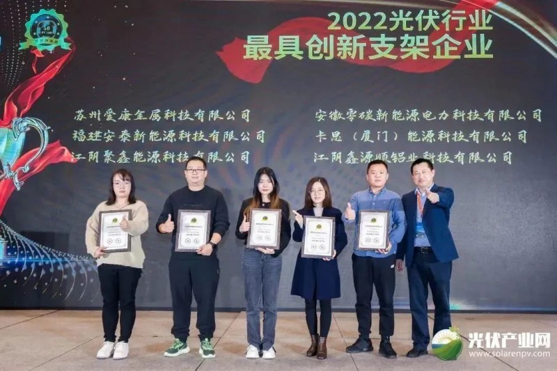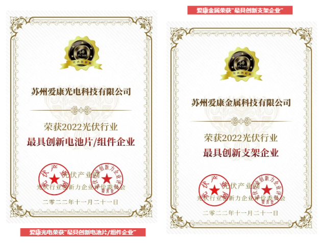 11月21日,2022第七屆光伏創新大會(PVIC2022)暨“PV TOP 50”2022光伏創新榜頒獎典禮在浙江杭州湖皇冠假日酒店隆重召開。愛康憑借行業領先的研發能力和創新水平,榮獲2022光伏行業“最具創新電池片/組件企業”和“最具創新支架企業”兩項業內重量級品牌大獎,綜合實力、創新力和競爭力再度得到業界權威認可。