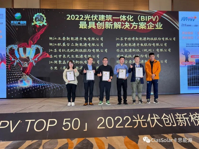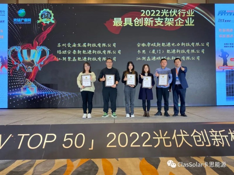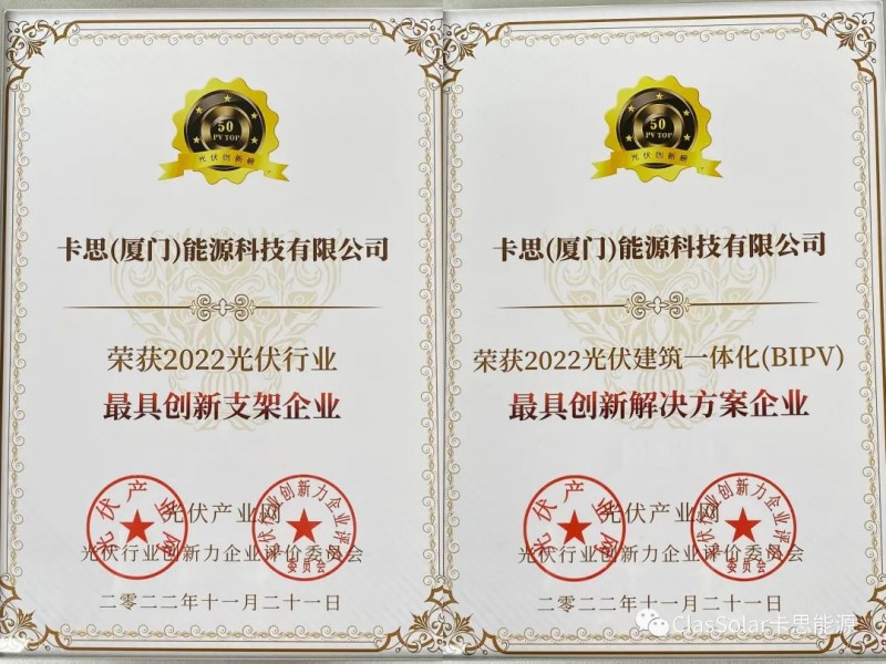 大會同期舉辦了「PV TOP 50」2022光伏創新榜頒獎典禮,旨在表彰過去一年中引領行業技術升級、最具表率作用的創新型標桿企業。 經過專家的嚴格評審,卡思憑借在分布式領域的領先優勢,再獲業界認可,在本次大會上榮膺“2022光伏行業最具創新支架企業”和“2022光伏建筑一體化(BIPV)最具創新解決方案企業”兩項殊榮。此次獲獎既是對我司過去一年市場表現的肯定,更是對我司未來更高的期許!