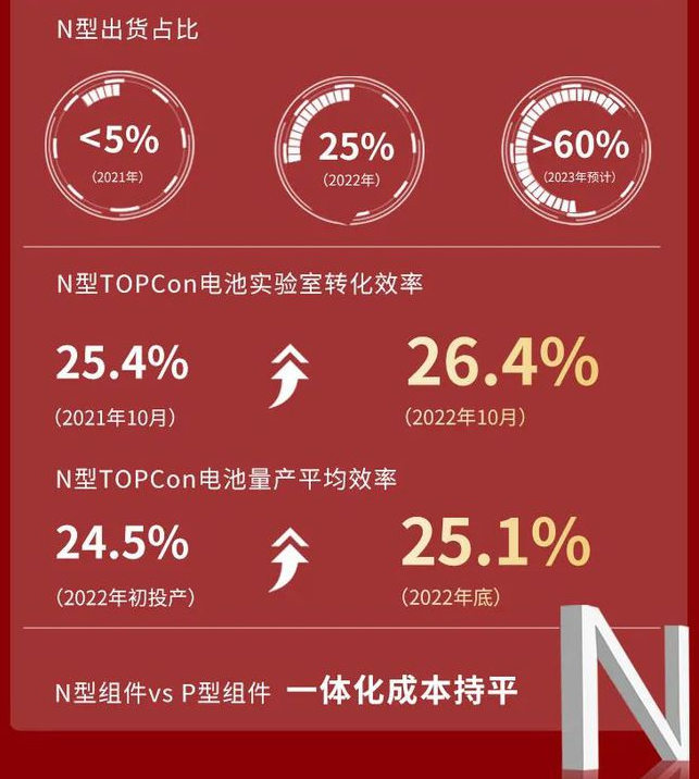 目前,公司已投產N型產能35GW,已實現N型組件與P型組件一體化成本持平,N型TOPCon電池量產平均效率已達25.1%。展望2023年,目前N型市場需求旺盛,預計N型組件將成為出貨主力,晶科能源預期N型產品出貨占比從2022年的25%進一步提升至60%以上。