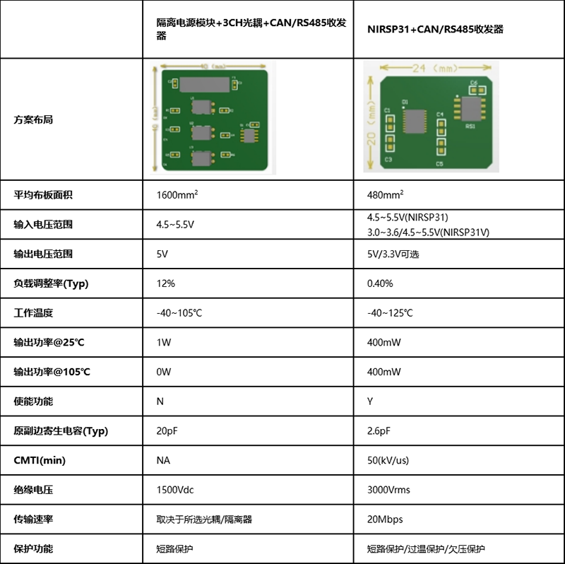 上表為NIRSP31與傳統的隔離電源模塊方案的詳細參數對比,總結來說,NIRSP31有如下優勢: