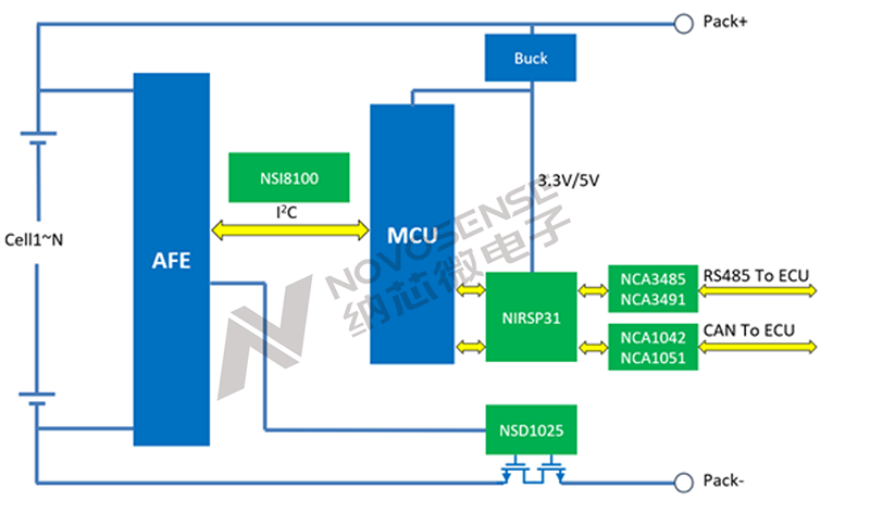 同時,納芯微也提供工業BMS一站式解決方案,包括雙向I2C隔離器NSI8100、RS485收發器NCA3485/NCA3491、CAN收發器NCA1042/NCA1051、以及雙路低邊驅動器NSD1025。