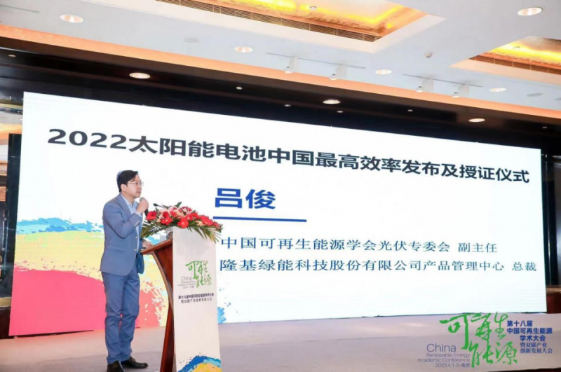 中國可再生能源學會光伏專委會副主任、隆基綠能產品管理中心總裁呂俊博士進行《2022太陽電池中國最高效率》發布。