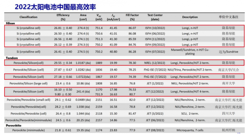 2022太陽電池中國最高效率發布,隆基綠能共有7個電池效率入選,占此次效率結果發布的近1/2。