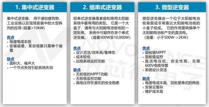 目前,光伏系統主要分為集中式逆變器、組串式逆變器和微型逆變器。集中式逆變器是大型、超大功率光伏逆變器,主要應用于大型工商業發電系統;組串式逆變器是家庭和商用太陽能系統最常用的類型,成本較低,設計靈活且效率高。