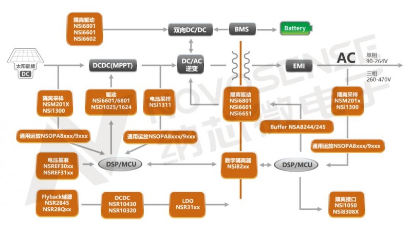 值得一提的典型產品包括,15mm爬電距離多通道數字隔離器NSi822x/3x/4x DSWWR;Vref輸出集成電流傳感器NSM2013;帶參考/故障輸出的集成電流傳感器NSM2015;40V/5MHz/低偏移/RRIO放大器NSOPA9051/9052/9054;以及高性能電流模式PWM控制器NSR284x。這些都是納芯微完整解決方案中頗具代表性的產品,可以為客戶的光儲系統提供完整的模擬IC解決方案。