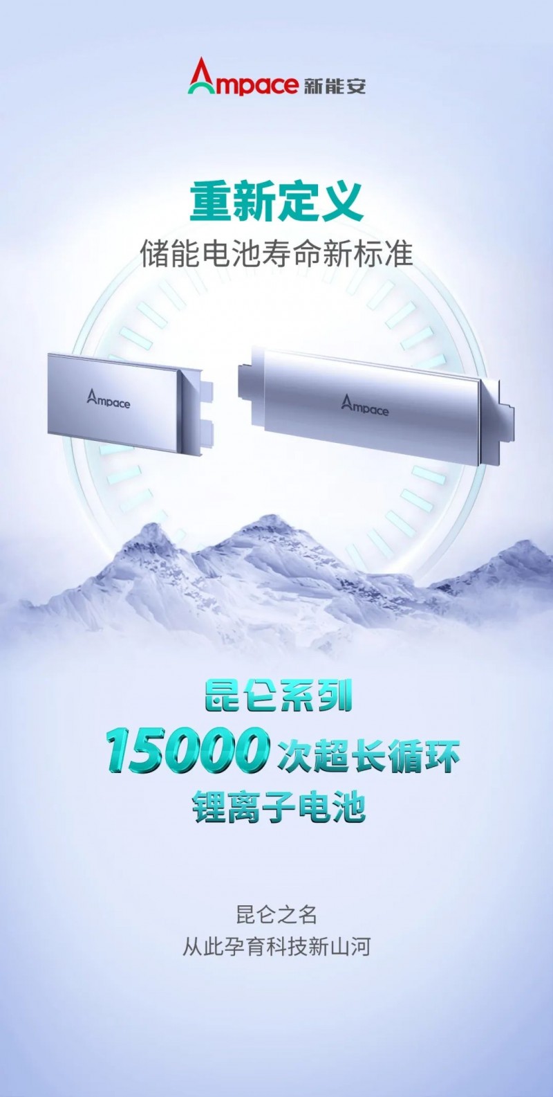 在主題為“新能智儲 聚量能安”的新品發布會上,Ampace新能安重磅首發昆侖系列15000次超長循環鋰電池,顛覆性革新鋰電池循環壽命行業極限,重新定義儲能電池壽命新標準。