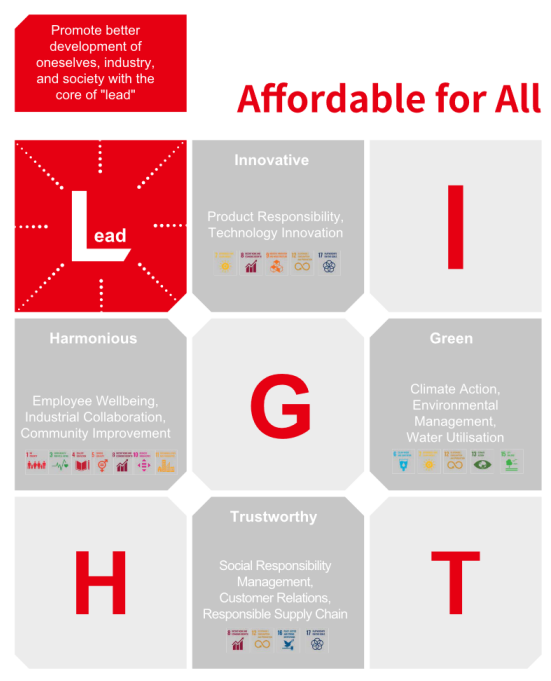 在報告中,隆基提出了“讓人人享有可負擔(dān)的清潔能源(Affordable for All)”的可持續(xù)發(fā)展目標,結(jié)合公司發(fā)展戰(zhàn)略、行業(yè)特點、國家發(fā)展規(guī)劃以及聯(lián)合國可持續(xù)發(fā)展目標,以“引領(lǐng)(Lead)”“創(chuàng)新(Innovative)”“綠色(Green)”“和諧(Harmonious)”“信賴(Trustworthy)”5項要素,形成了隆基“LIGHT”可持續(xù)發(fā)展理念體系。