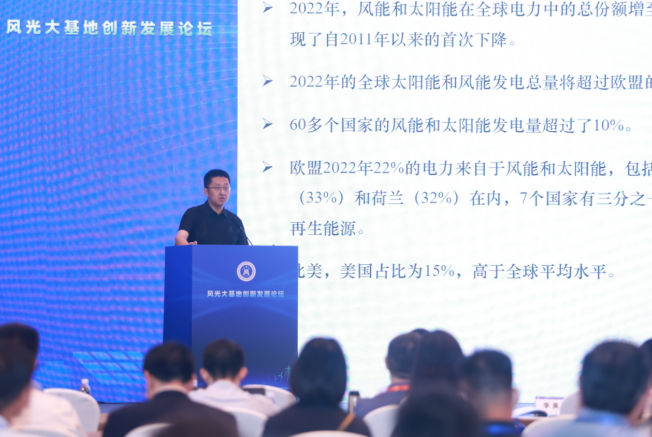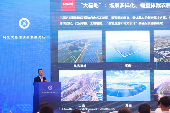 東方電氣風電股份有限公司研究設計院余業祥副院長談到風光大基地面臨電能消納、電網穩定、風機質量、項目收益、重復投資等多重問題,安全可靠的綜合解決方案是大基地建設需關注的首要問題。隆基綠能中國地區部產品解決方案專家馬競濤指出,可靠的高性能光伏發電系統,是風光大基地高質量建設的重要一環。隆基通過產品、系統和生命周期多維度的考量為客戶提供覆蓋多種應用場景的產品解決方案,滿足個性化需求的定制化電站解決方案和涵蓋全生命周期的專業服務,有力保障電站高效運行,全方位守護客戶價值。