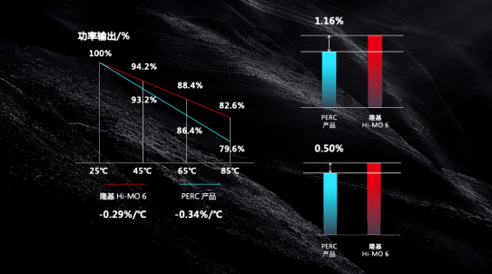 在極端天氣頻發的當下,峰值功率溫度系數絕對數值更小的組件產品顯然更受歡迎。以隆基Hi-MO 6高效組件產品為例,它的峰值功率溫度系數就控制在了-0.29%/℃,相較目前主流的PERC組件有著明顯的高溫發電性能提升。