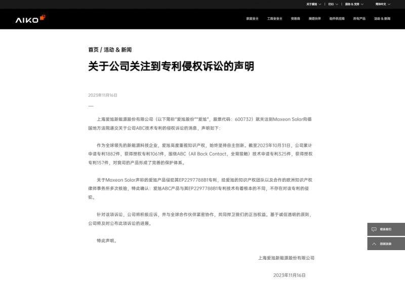 11月15日,太陽(yáng)能電池板制造商Maxeon Solar向德國(guó)地方法院遞交關(guān)于愛(ài)旭股份ABC技術(shù)專利的侵權(quán)訴訟。隨即,在11月16日,愛(ài)旭股份發(fā)布聲明稱,經(jīng)其知識(shí)產(chǎn)權(quán)團(tuán)隊(duì)以及合作的歐洲知識(shí)產(chǎn)權(quán)律師事務(wù)所多次核驗(yàn),確認(rèn)兩者專利技術(shù)有著根本的不同,不存在對(duì)該專利的侵犯。
