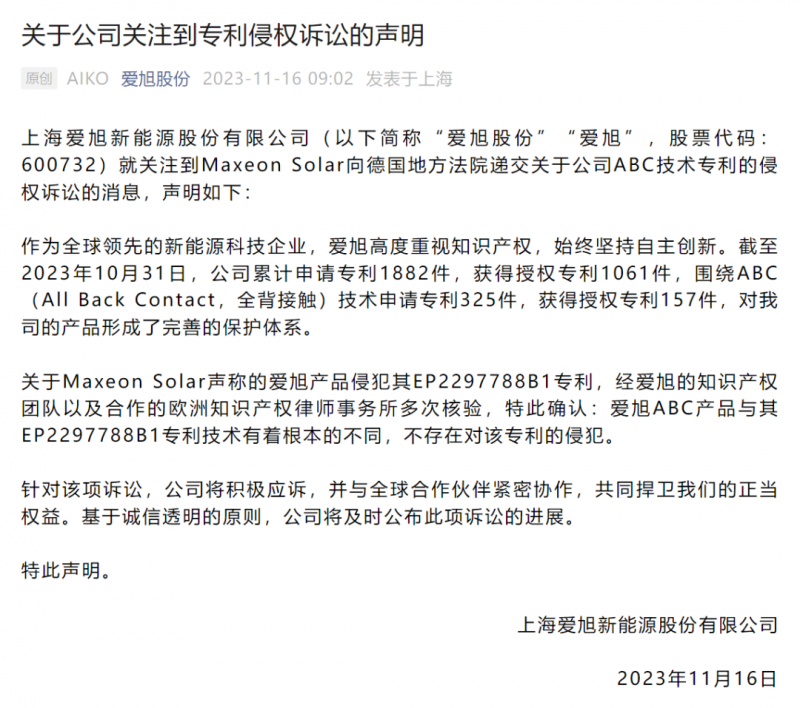 11月16日早9時許,愛旭股份發布聲明稱,經其知識產權團隊以及合作的歐洲知識產權律師事務所多次核驗,確認兩者專利技術有著根本的不同,不存在對該專利的侵犯。愛旭股份表示,尚未正式收到應訴通知書。收到后若判斷達到披露標準,將依照上交所相關規定披露信息,并將積極應訴。