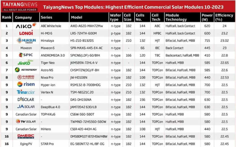2023年10月,TaiyangNews發布10月全球組件最高效率排名,其中愛旭ABC組件以24%的轉換效率位列榜首。事實上,這已是愛旭的ABC連續第八個月來排名第一,打破了國外企業對該榜單的長期壟斷。