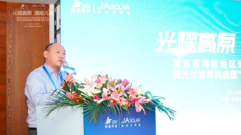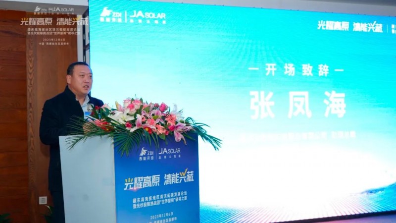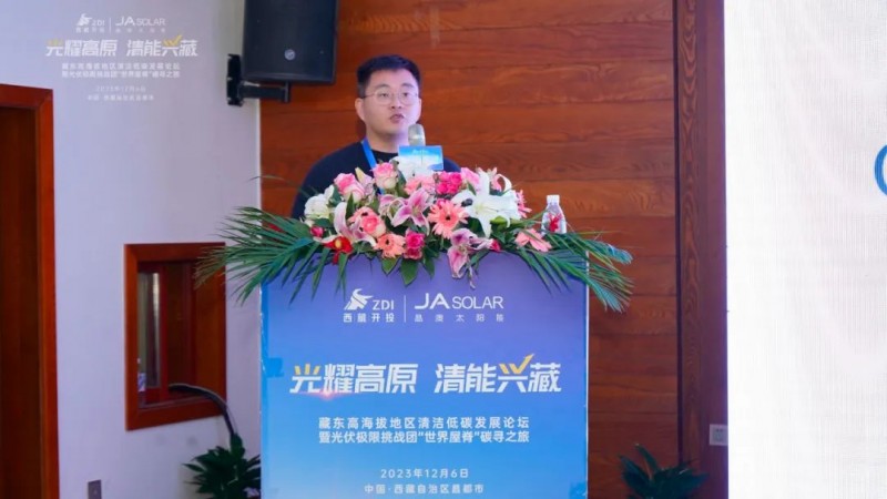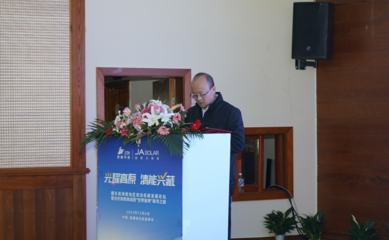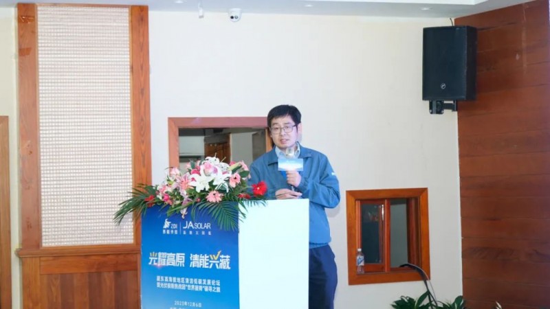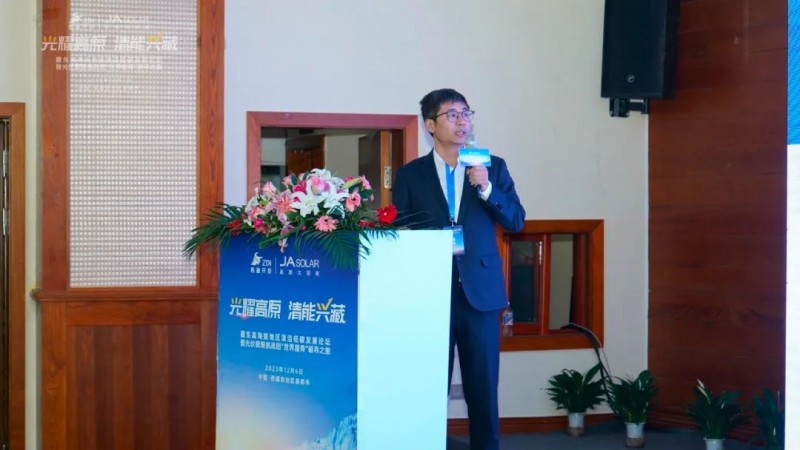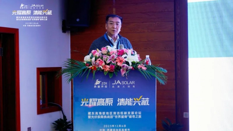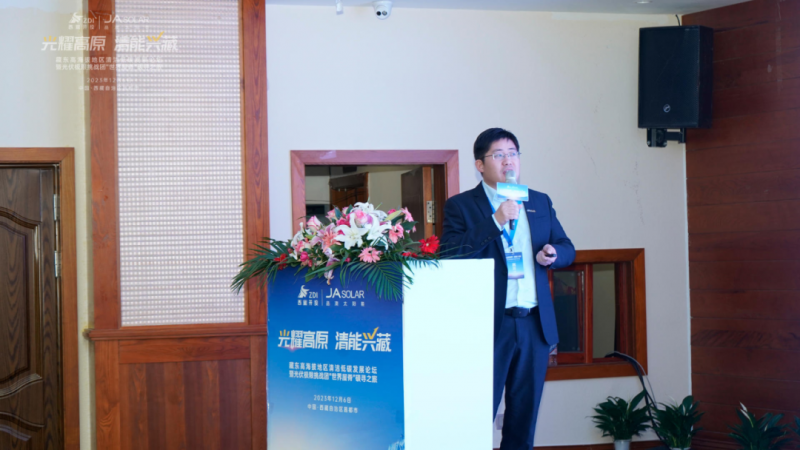 晶澳科技助理總裁張鳳海也為大會(huì)進(jìn)行了精彩致辭。他介紹,克服超高海拔、高寒缺氧、群山高聳等惡劣的自然條件,于上個(gè)月剛剛并網(wǎng)的昌都市察雅縣吉塘200MW+160MWh儲(chǔ)能牧光互補(bǔ)復(fù)合型光伏項(xiàng)目,采用晶澳科技新一代n型DeepBlue 4.0 Pro組件,產(chǎn)品具備更低衰減、更優(yōu)高溫發(fā)電性能、更高雙面增益及更好弱光性能,并通過了包括高寒、高紫外、低空氣密度、冰雪載荷等系列嚴(yán)苛環(huán)境下的可靠性能測(cè)試,能夠完美適應(yīng)高海拔地區(qū)的環(huán)境與氣候條件,為電站高效安全穩(wěn)定地運(yùn)行提供了有力保障。
