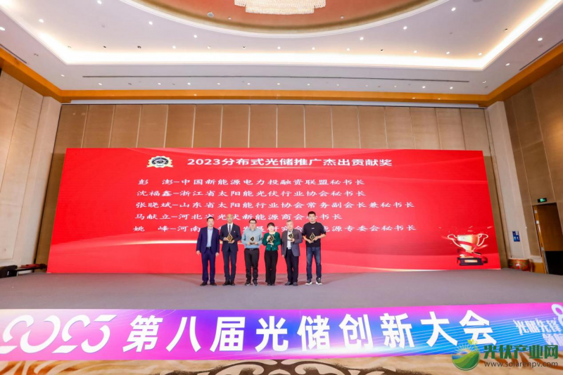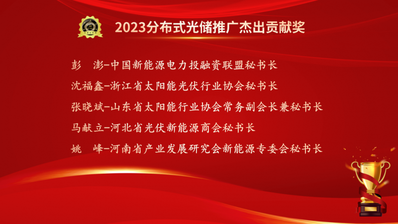 晚會最后還特別給中國新能源電力投融資聯盟秘書長彭澎、浙江省太陽能光伏行業協會秘書長沈福鑫、山東省太陽能行業協會常務副會長兼秘書長張曉斌、河北省光伏新能源商會秘書長馬獻立、河南省產業發展研究會新能源專委會秘書長 姚峰頒發了2023分布式光儲推廣杰出貢獻獎!