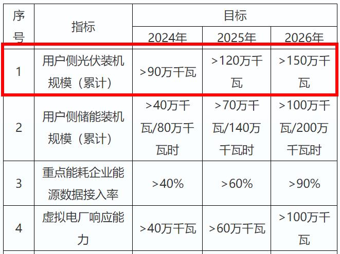 關(guān)于用戶側(cè)光伏裝機(jī)規(guī)模目標(biāo),文件明確,到2024年累計裝機(jī)規(guī)模大于90萬千瓦,到2025年累計裝機(jī)規(guī)模大于120萬千瓦,到2026年累計裝機(jī)規(guī)模大于150萬千瓦。