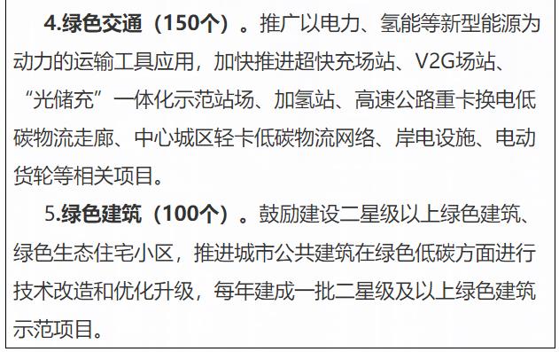 4.綠色交通(150個)。推廣以電力、氫能等新型能源為動力的運(yùn)輸工具應(yīng)用,加快推進(jìn)超快充場站、V2G場站、“光儲充”一體化示范站場、加氫站、高速公路重卡換電低碳物流走廊、中心城區(qū)輕卡低碳物流網(wǎng)絡(luò)、岸電設(shè)施、電動貨輪等相關(guān)項(xiàng)目。