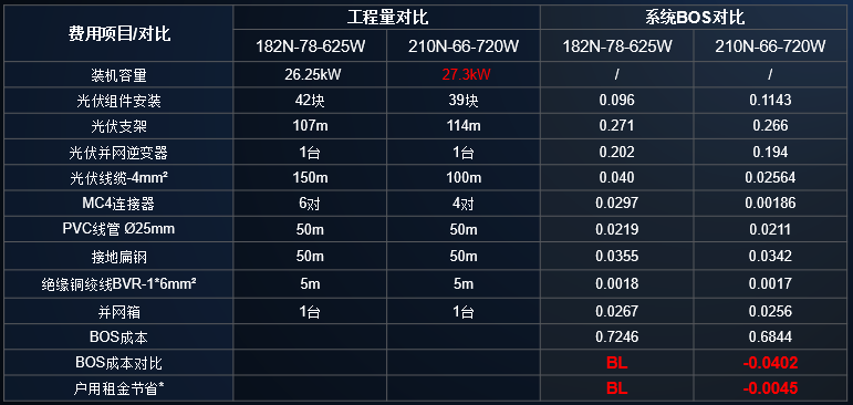 在戶用分布式場景下,以河南鄭州某戶用屋頂測算項目為例,與182N-625W組件相比,至尊N型720W組件在同一戶用屋頂裝機量提升4%,BOS成本節省約4.02分/W,在新一代超高功率組件中系統價值全面勝出。