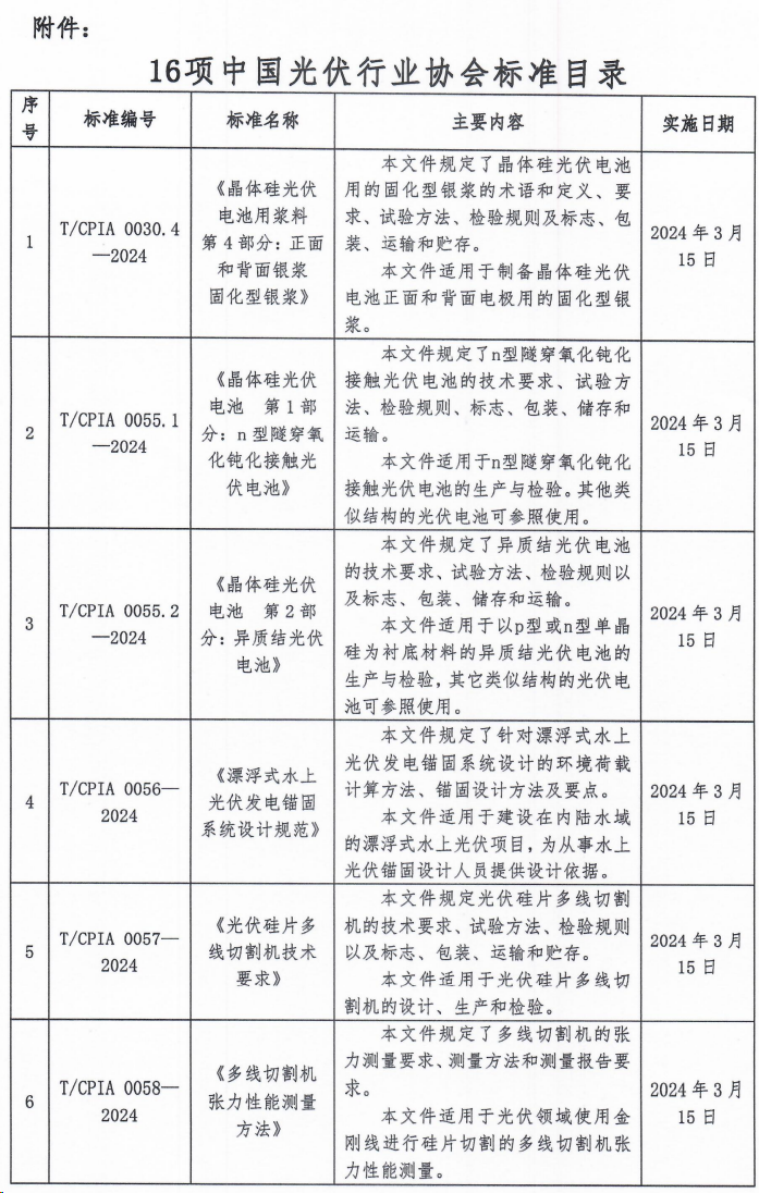 中國光伏行業協會批準發布16項中國光伏行業協會標準,其標準編號和標準名稱如下: