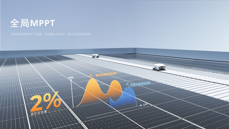 ?全局MPPT掃描,提升系統發電量2%。進一步優化陽光獨有的全局MPPT算法,通過全曲線掃描,避免局部多峰干擾,精準追蹤最大功率點,顯著提升多陰影等復雜環境下的發電表現。