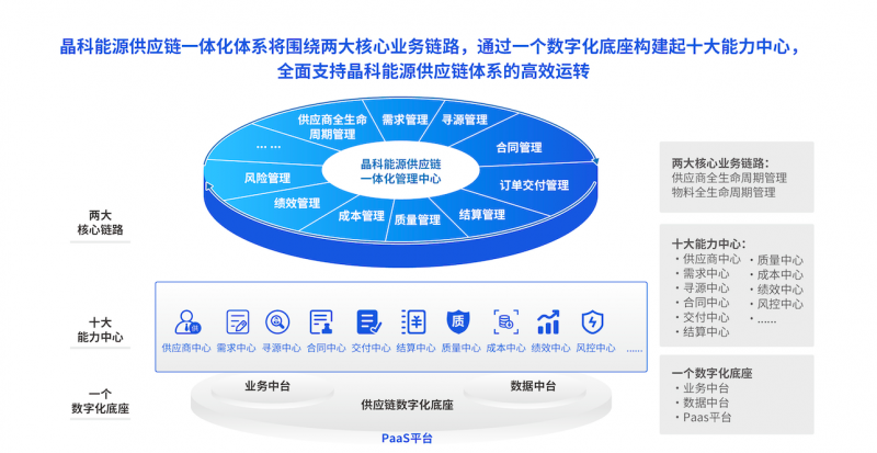 為貫徹“保供應、降成本、建體系”的戰略方向規劃,晶科能源攜手端點科技以“提效、降本、合規、發展”為升級目標,分步實施構建自主可控的供應鏈一體化平臺。平臺通過構建需求中心、尋源中心、合同中心等十大能力中心,建立集團級采購業務一體化管理體系,實現內部各事業部與外部供應商及合作伙伴間的高效協同,支撐跨事業部集中采購,提升規模化效益,支持晶科能源供應鏈體系的高效運轉。