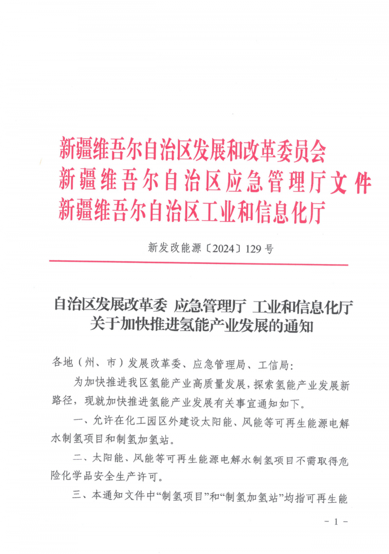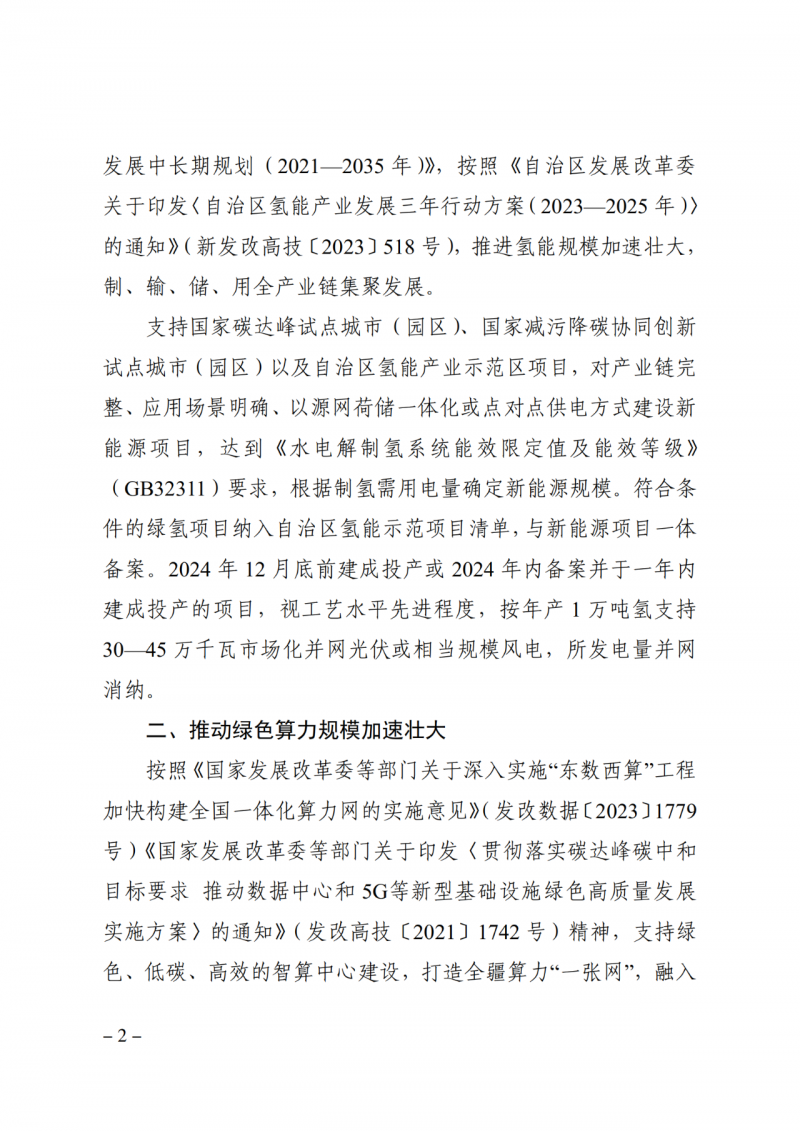 支持國家碳達峰試點城市(園區)、國家減污降碳協同創新試點城市(園區)以及自治區氫能產業示范區項目,對產業鏈完整、應用場景明確、以源網荷儲一體化或點對點供電方式建設新能源項目,達到《水電解制氫系統能效限定值及能效等級》(GB32311)要求,根據制氫需用電量確定新能源規模。符合條件的綠氫項目納入自治區氫能示范項目清單,與新能源項目一體備案。2024年12月底前建成投產或2024年內備案并于一年內建成投產的項目。