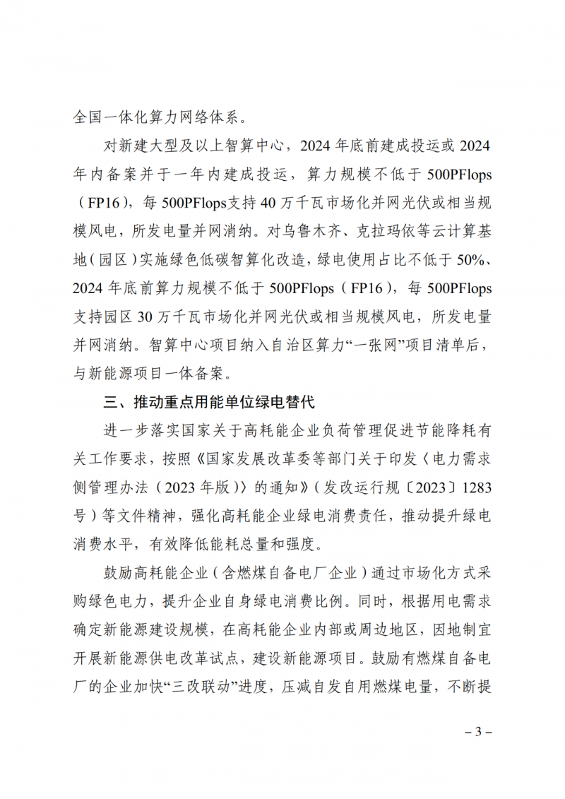 對新建大型及以上智算中心,2024年底前建成投運或2024年內備案并于一年內建成投運,算力規模不低于500PFlops(FP16),每500PFlops支持40萬千瓦市場化并網光伏或相當規模風電,所發電量并網消納。對烏魯木齊、克拉瑪依等云計算基地(園區)實施綠色低碳智算化改造,綠電使用占比不低于50%、2024年底前算力規模不低于500PFlops(FP16),每500PFlops支持園區30萬千瓦市場化并網光伏或相當規模風電,所發電量并網消納。