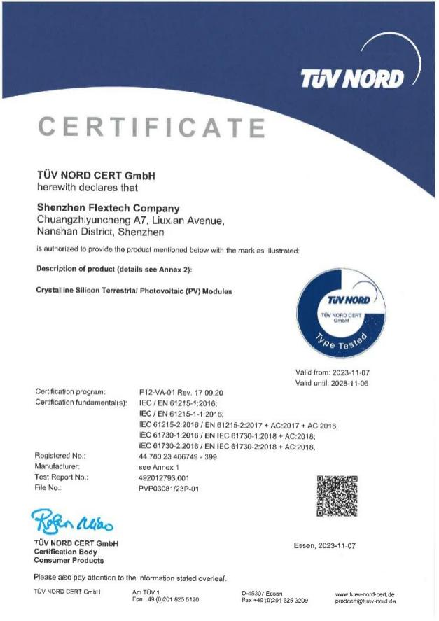 且在2023年10月,FS-OF系列輕質柔性光伏組件全面通過國際權威認證機構TÜV北德IEC61215/IEC61730系列標準測試的挑戰和考驗。