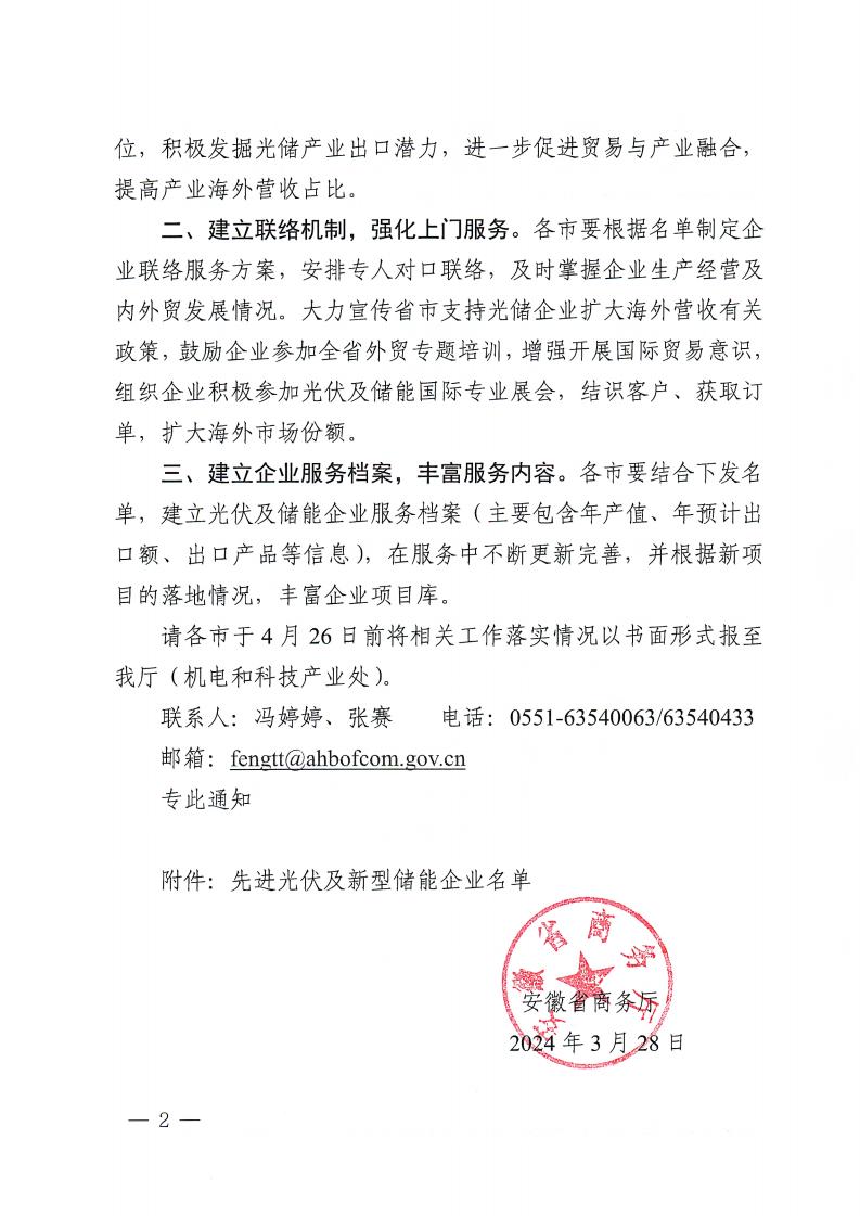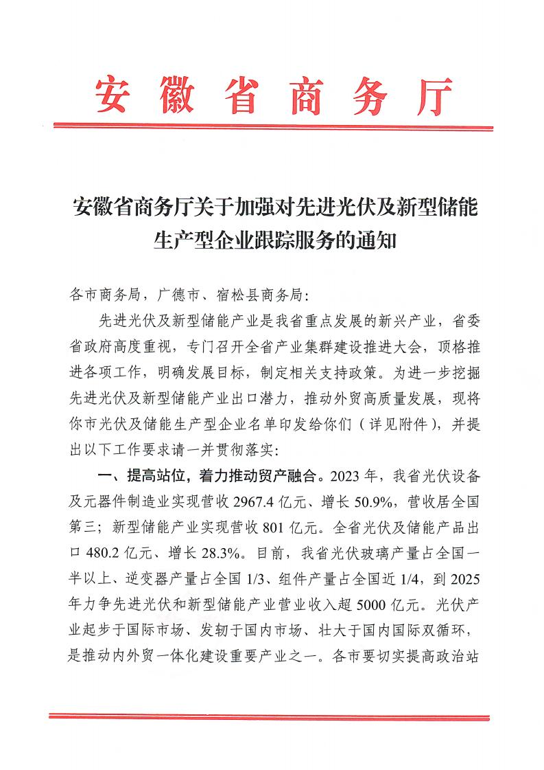 4月1日,安徽省商務(wù)廳發(fā)布關(guān)于加強(qiáng)對(duì)先進(jìn)光伏及新型儲(chǔ)能生產(chǎn)型企業(yè)跟蹤服務(wù)的通知。文件明確,2023年,我省光伏設(shè)備及元器件制造業(yè)實(shí)現(xiàn)營(yíng)收2967.4億元、增長(zhǎng)50.9%,營(yíng)收居全國(guó)第三;新型儲(chǔ)能產(chǎn)業(yè)實(shí)現(xiàn)營(yíng)收801億元。全省光伏及儲(chǔ)能產(chǎn)品出口480.2億元、增長(zhǎng)28.3%。目前,我省光伏玻璃產(chǎn)量占全國(guó)一半以上、逆變器產(chǎn)量占全國(guó)1/3、組件產(chǎn)量占全國(guó)近1/4,到2025年力爭(zhēng)先進(jìn)光伏和新型儲(chǔ)能產(chǎn)業(yè)營(yíng)業(yè)收入超5000億元。