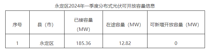 永定區一季度已接入分布式光伏容量為185.36MW,在途容量12.82MW,可新增開放容量為0。