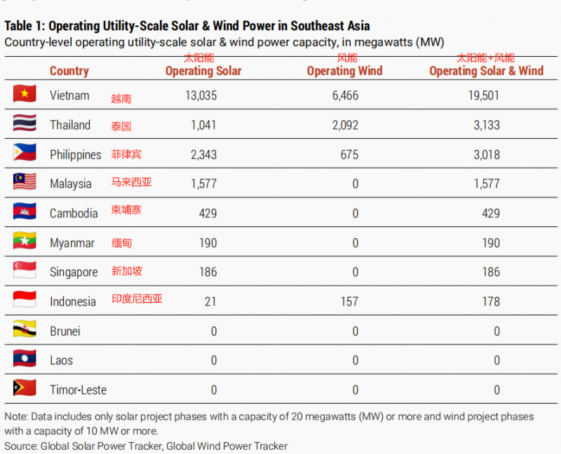 東南亞公用事業(yè)規(guī)模太陽能和風能發(fā)電容量:(單位:MW)