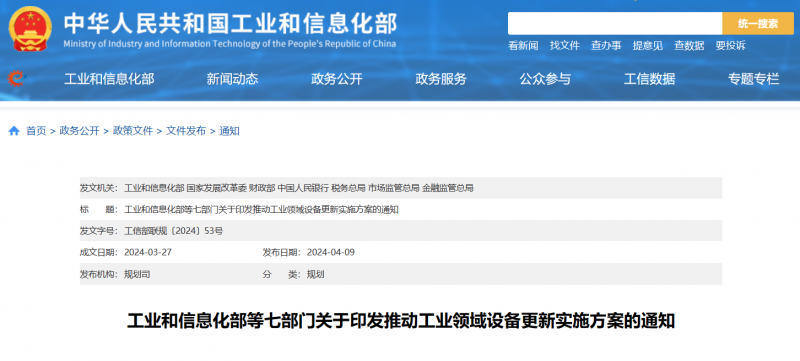 工業和信息化部等七部門關于印發推動工業領域設備更新實施方案的通知