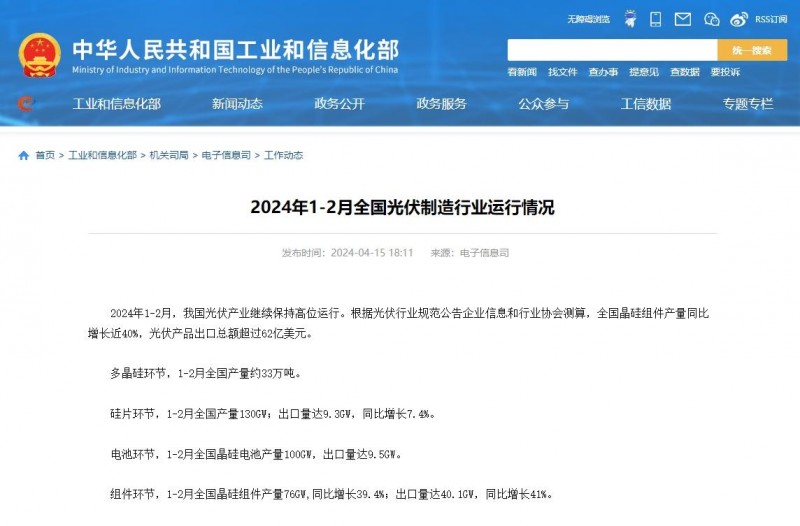 4月15日,工信部發(fā)布《2024年1-2月全國光伏制造行業(yè)運(yùn)行情況》。數(shù)據(jù)顯示,1-2月全國硅料,產(chǎn)量約33萬噸;硅片產(chǎn)量130GW;出口量達(dá)9.3GW,同比增長7.4%;電池100GW,出口量達(dá)9.5GW;組件產(chǎn)量76GW,同比增長39.4%;出口量達(dá)40.1GW,同比增長41%。