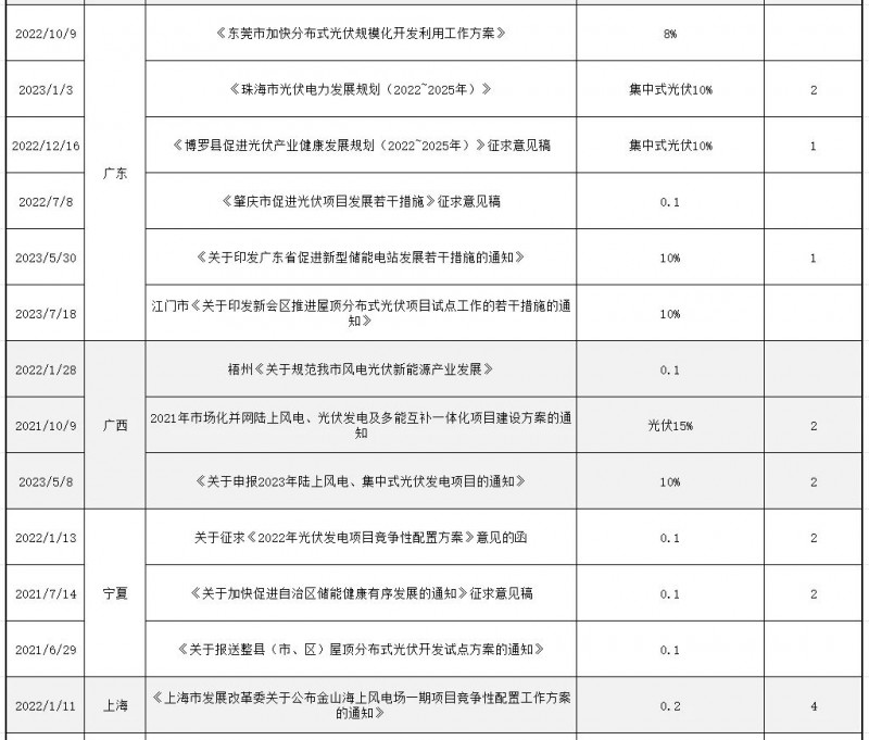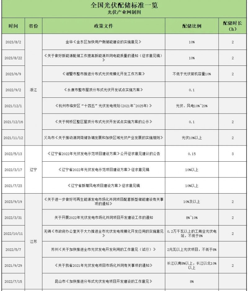 據光伏產業網不完全統計,2021年至今,全國已經有超過27個省份出臺了分布式光伏配儲的相關政策文件。具體來看,2021年前后,對大型集中式光伏電站要求配儲比例要求大多在10%,連續儲能時長為1-2小時,對工商業分布式光伏配儲則基本以自愿、鼓勵為主。