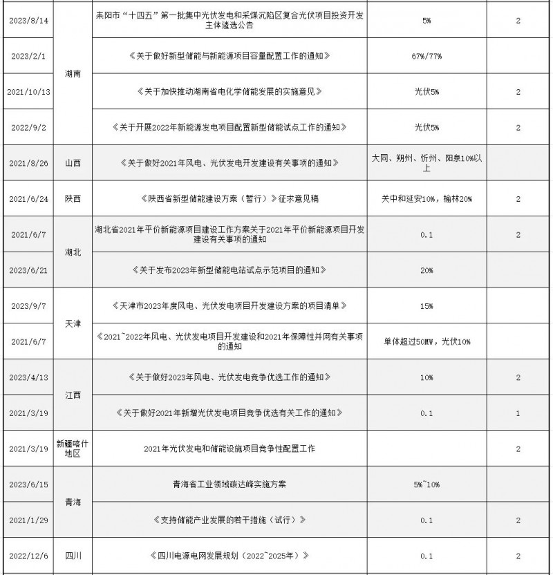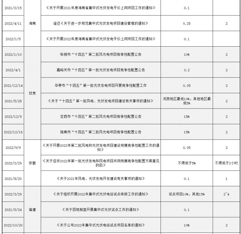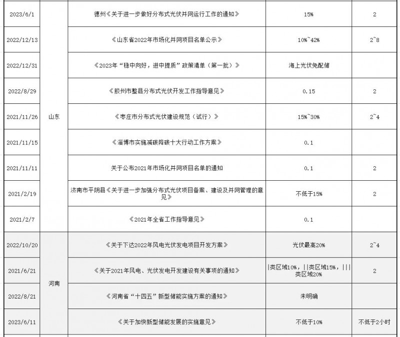 正因如此,近兩年光伏配儲逐漸從最初的鼓勵引導發展為并網標配,最后到不建受罰,比例也從原來10%逐步上升至不低于15%-30%,連續儲能時長也從原來的1-2小時抬升至3-4小時,呈現逐步走高態勢。