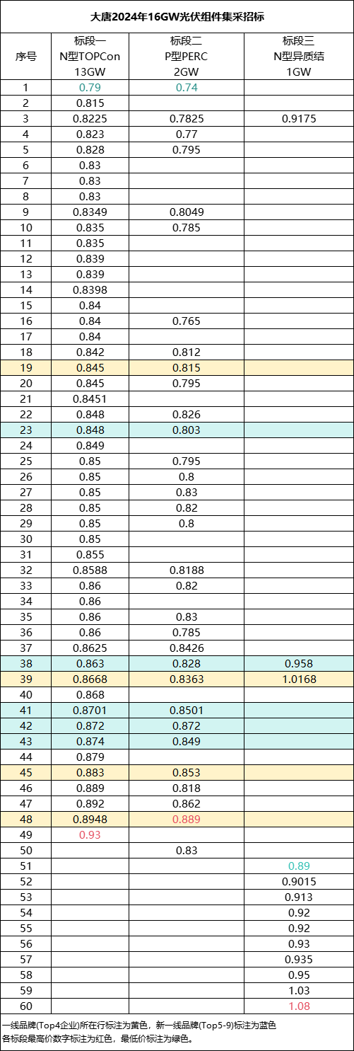 標(biāo)段一共49家企業(yè)參與,投標(biāo)單價(jià)0.79-0.93元/W,平均為0.8517元/W。Top9品牌報(bào)價(jià)整體相對(duì)較高,但也有1家一線、1家新一線報(bào)價(jià)低于整體均值。Top4品牌平均報(bào)價(jià)0.8724元/W,Top5-9品牌平均報(bào)價(jià)0.8654元/W。這是業(yè)內(nèi)首次有企業(yè)在央國(guó)企組件招標(biāo)中報(bào)出TOPCon組件含稅運(yùn)0.8元/W以下價(jià)格。