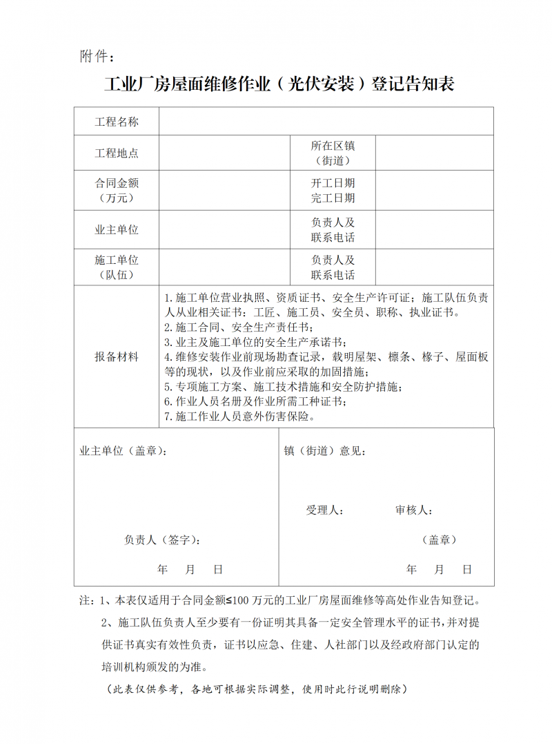 附件:工業(yè)廠房屋面維修作業(yè)(光伏安裝)登記告知表