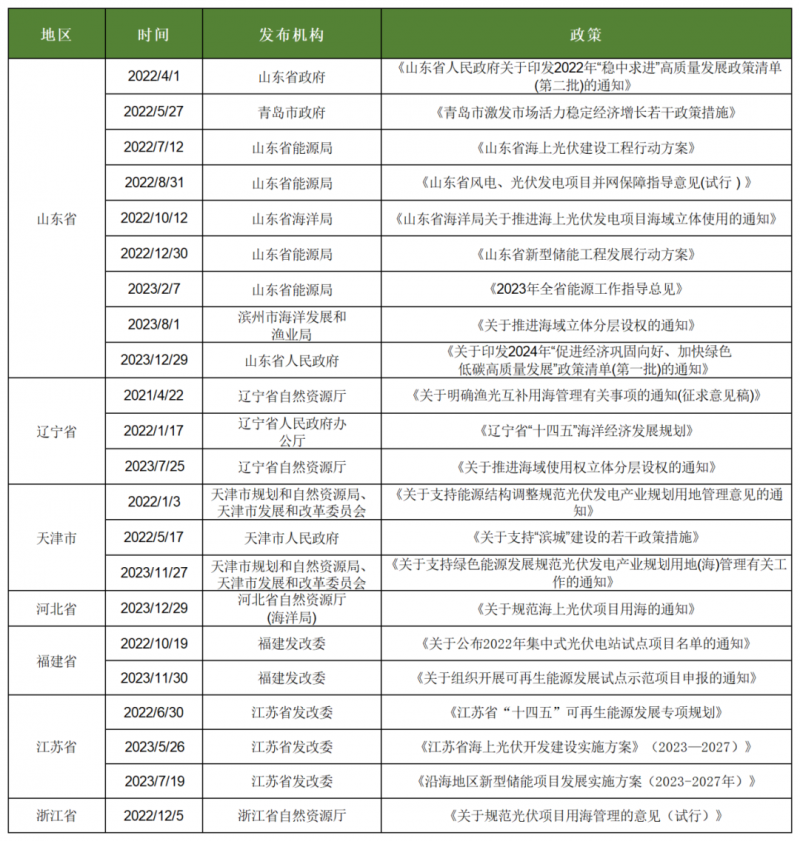 2023年4月,國家能源局發布的《2023年能源工作指導意見》提出,“要謀劃啟動建設海上光伏”;6月,自然資源部布鼓勵對海上光伏、海上風電等用海進行立體設權;10月,國家能源局又發布《關于組織開展可再生能源發展試點示范的通知》指出,鼓勵開展海上光伏試點,形成可復制可推廣的海上光伏開發模式。
