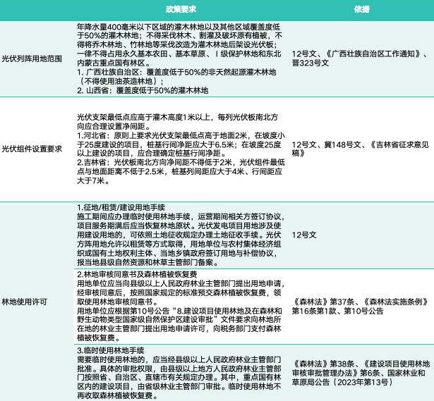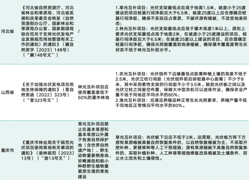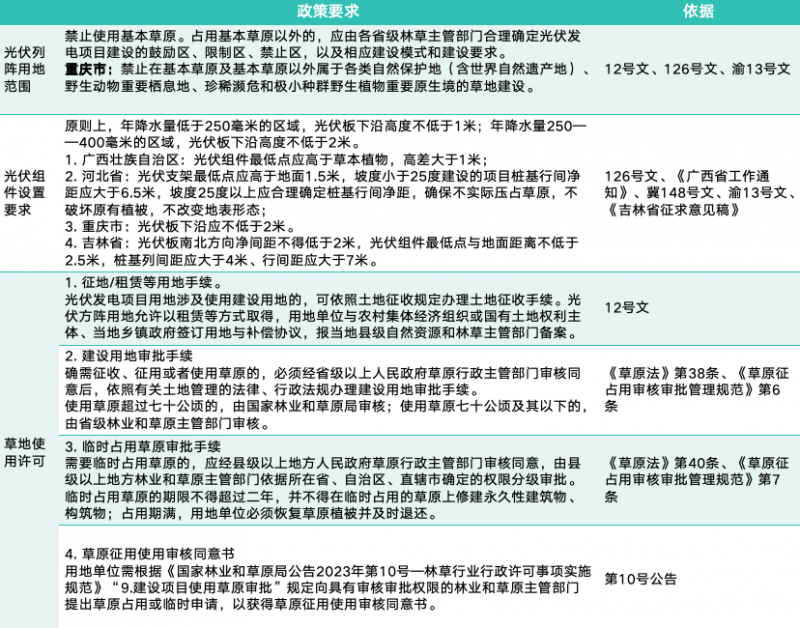 基于以上第二部分所述的規定,同時根據《草原法》《森林法》《國家林業和草原局公告2023年第10號—林草行業行政許可事項實施規范》(“第10號公告”)等相關法律法規及政策規定,筆者將常見的復合光伏項目類型,即草光互補、林光互補、農光互補、漁光互補等的光伏列陣用地范圍以及項目建設和運營要求總結如下: