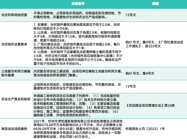 因此,近年來部分地區監管部門對復合光伏項目進行了重點核查,如山東省自然資源廳于2021年11月2日下發《關于對光伏項目用地進行核查的通知》,要求重點核查復合光伏項目履行項目建設方案和土地復合利用方案備案程序,以及布設在農用地上的光伏設施是否存在硬化地面、破壞耕作層、拋荒、撂荒、影響農業生產等情況,并曾一度暫停對占用耕地光伏項目的備案;河北省發改委、河北省自然資源廳也于2022年5月11日聯合發布《關于進一步明確存量光伏復合項目占用耕地政策的通知》,要求市縣有關部門加強事中事后監管,確保項目以農為主、光伏為輔,農業與光伏產業互補共贏,嚴禁“只有光、沒有農、未互補”;山西省自然資源廳同樣于2023年7月19日要求對單純依賴光伏發電而對農用地進行拋荒、撂荒的“農光互補”“林光互補”項目進行排查處理。