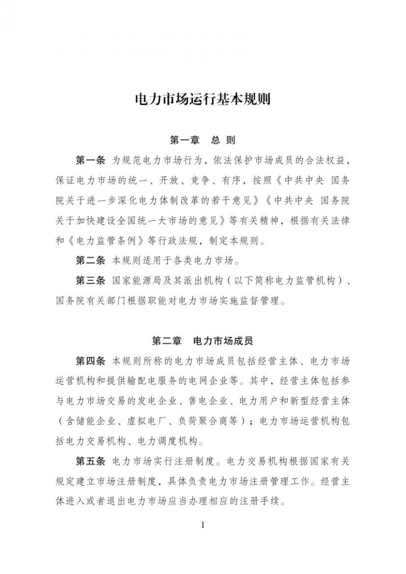 5月14日,國(guó)家發(fā)改委公開(kāi)發(fā)布《電力市場(chǎng)運(yùn)行基本規(guī)則》。本規(guī)則所稱的電力市場(chǎng)成員包括經(jīng)營(yíng)主體、電力市場(chǎng)運(yùn)營(yíng)機(jī)構(gòu)和提供輸配電服務(wù)的電網(wǎng)企業(yè)等。其中,經(jīng)營(yíng)主體包括參與電力市場(chǎng)交易的發(fā)電企業(yè)、售電企業(yè)、電力用戶和新型經(jīng)營(yíng)主體(含儲(chǔ)能企業(yè)、虛擬電廠、負(fù)荷聚合商等);電力市場(chǎng)運(yùn)營(yíng)機(jī)構(gòu)包括電力交易機(jī)構(gòu)、電力調(diào)度機(jī)構(gòu)。