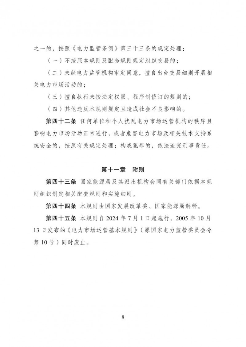 《電力市場(chǎng)運(yùn)行基本規(guī)則》已經(jīng)2024年4月18日第11次委務(wù)會(huì)議審議通過(guò),現(xiàn)予公布,自2024年7月1日起施行。