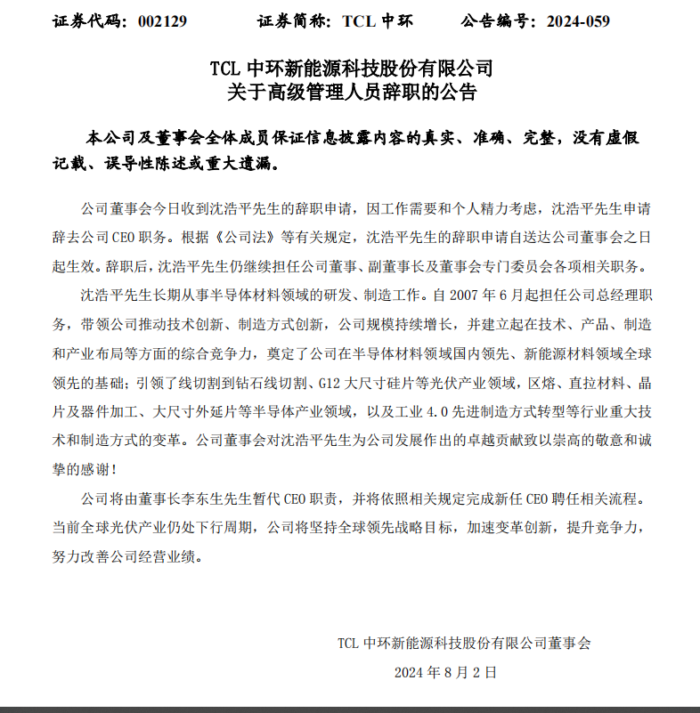 公告中未提及沈浩平辭職的具體原因。從TCL中環(huán)所處的光伏產(chǎn)業(yè)發(fā)展環(huán)境來看,3年上升周期已成過去,自2023年第三季度始,行業(yè)進入下行周期。