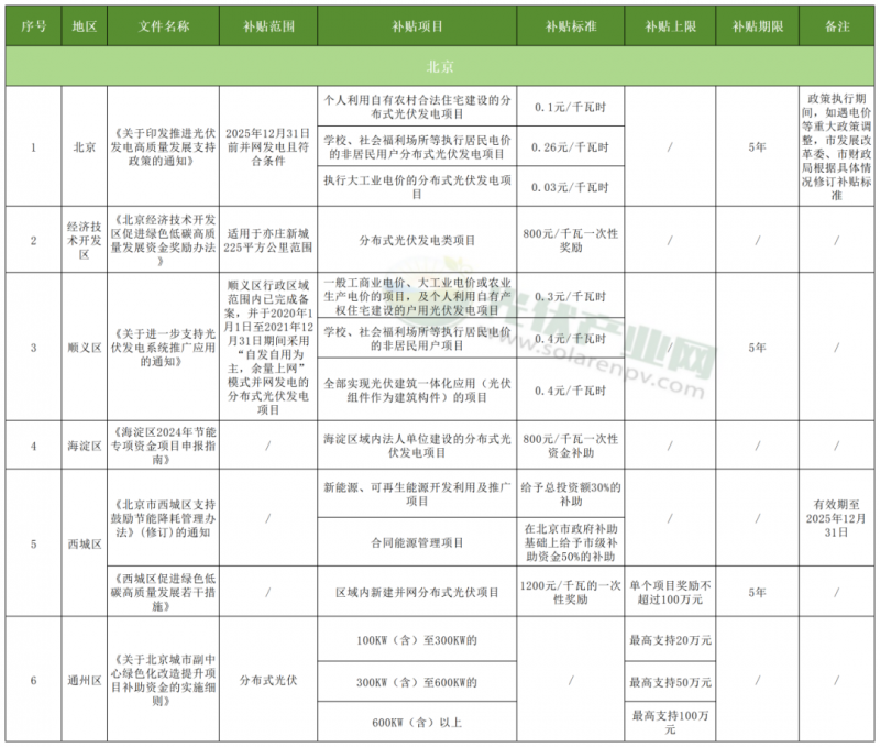 北京、北京經濟技術開發區、北京順義區、北京海淀區、北京西城區、北京通州區6地發布補貼政策,在0.03-0.4元/千瓦時不等。其中北京經開區對分布式光伏發電項目,按照裝機容量給予每千瓦800元的一次性獎勵;北京市西城區對區域內新建并網分布式光伏項目,按照并網裝機容量給予每千瓦1200元的一次性獎勵,單個項目獎勵不超過100萬元。