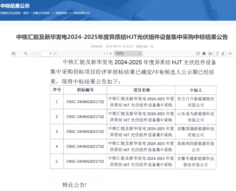 此項目中標五家單位之一國晟科技,其N型HJT產品近期屢獲央國企客戶認可,市場占比和品牌影響力提升顯著。僅觀察其過去幾個月面向國內大型集中式光伏項目的合同簽約情況,先后有中廣核煙臺招遠400MW海上光伏項目、中廣核萊州土山600MW鹽光互補項目,中綠電若羌4GW光伏II標段項目,又在此次中核匯能及新華發電2GW集采招標中再度入圍上榜。