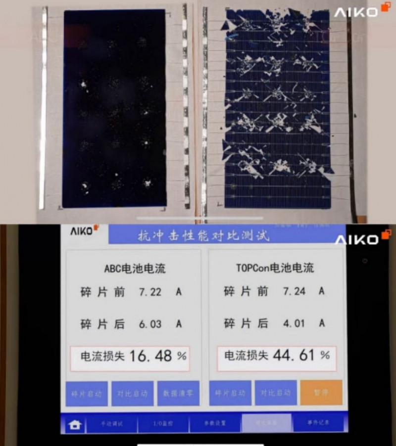 為了更直觀地展現愛旭N型ABC組件的抗隱裂能力,愛旭專門在SNEC展臺上設立了單片電池沖擊性能測試,對不同產品的抗沖擊性能及受沖擊后的電流損失進行對比。實驗中,在2公斤1.1米/秒的機械沖擊下,TOPCon電池片基本碎裂,電池片從沖擊處向四周大面積碎裂開來,電流損失高達44.61%;而同樣條件下的N型ABC組件僅在遭受沖擊的接觸面處發生斷裂,電流損失降至16.48%,且涂布電極依然緊密地連接著電池片,并未散亂。