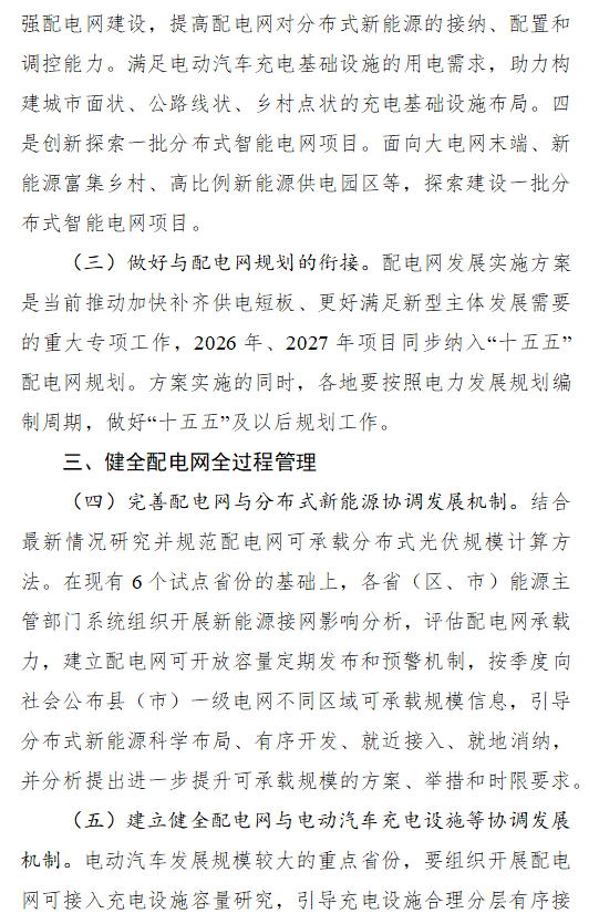 完善配電網與分布式新能源協調發展機制。結合最新情況研究并規范配電網可承載分布式光伏規模計算方法。在現有6個試點省份的基礎上,各省(區、市)能源主管部門系統組織開展新能源接網影響分析,評估配電網承載力,建立配電網可開放容量定期發布和預警機制,按季度向社會公布縣(市)一級電網不同區域可承載規模信息,引導分布式新能源科學布局、有序開發、就近接入、就地消納,并分析提出進一步提升可承載規模的方案、舉措和時限要求。