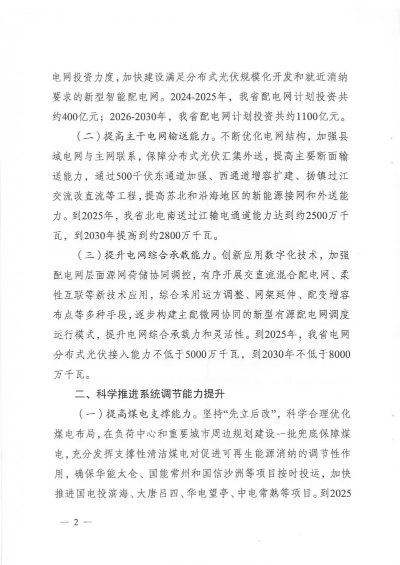 通知提出,加快配電網升級改造。積極適應大規模分布式光伏快速發展的新形勢,有針對性地開展全省城鄉新型配電網的規劃構造,堅持系統思維和問題導向,適度超前規劃建設,有序加大配電網投資力度,加快建設滿足分布式光伏規模化開發和就近消納要求的新型智能配電網。2024-2025年,我省配電網計劃投資共約400億元;2026-2030年,我省配電網計劃投資共約1100億元。