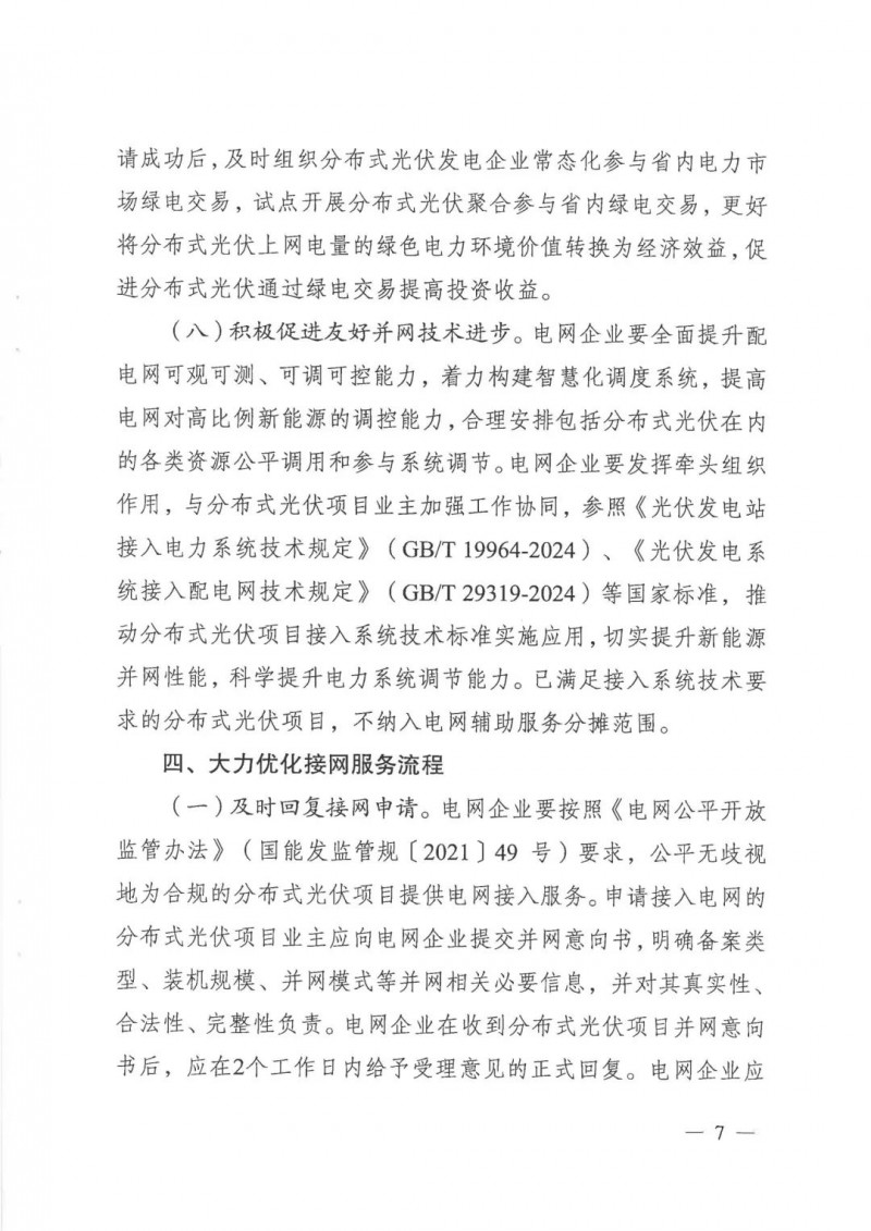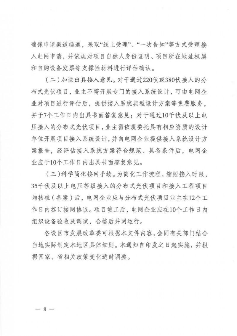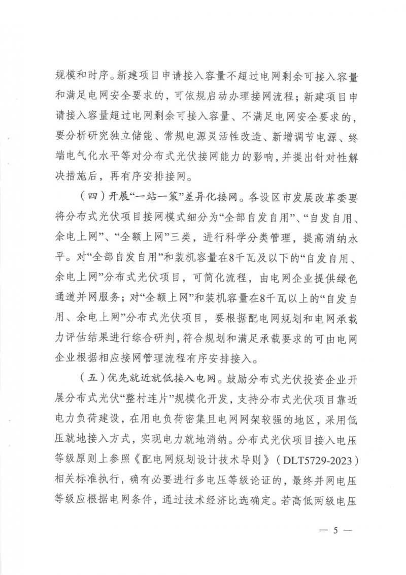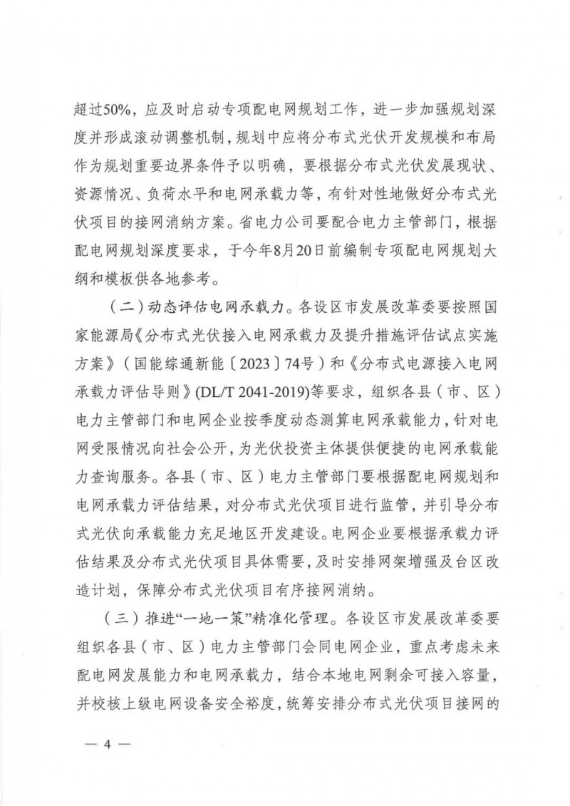 推進“一地一策”精準化管理。各設區市發展改革委要組織各縣(市、區)電力主管部門會同電網企業,重點考慮未來配電網發展能力和電網承載力,結合本地電網乘余可接入容量,并校核上級電網設備安全裕度,統籌安排分布式光伏項目接網的規模和時序。新建項目申請接入容量不超過電網剩余可接入容量和滿足電網安全要求的,可依規啟動辦理接網流程;新建項目申請接入容量超過電網剩余可接入容量、不滿足電網安全要求的,要分析研究獨立儲能、常規電源靈活性改造、新增調節電源、終端電氣化水平等對分布式光伏接網能力的影響,并提出針對性解決措施后,再有序安排接網。