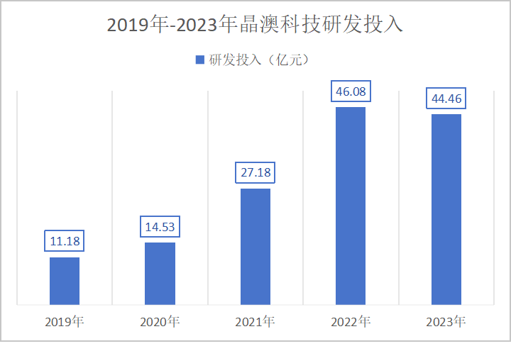 2019-2022年,晶澳科技的研發(fā)投入分別為11.18億元、14.53億元、27.18億元、46.08億元,2021、2022年兩年的研發(fā)投入合計(jì)超73億元。2023年,晶澳科技研發(fā)投入44.46億元,占營業(yè)收入5.45%,位居同行業(yè)前列。截至2023年末,公司自主研發(fā)已授權(quán)專利1263項(xiàng),其中發(fā)明專利285項(xiàng)。